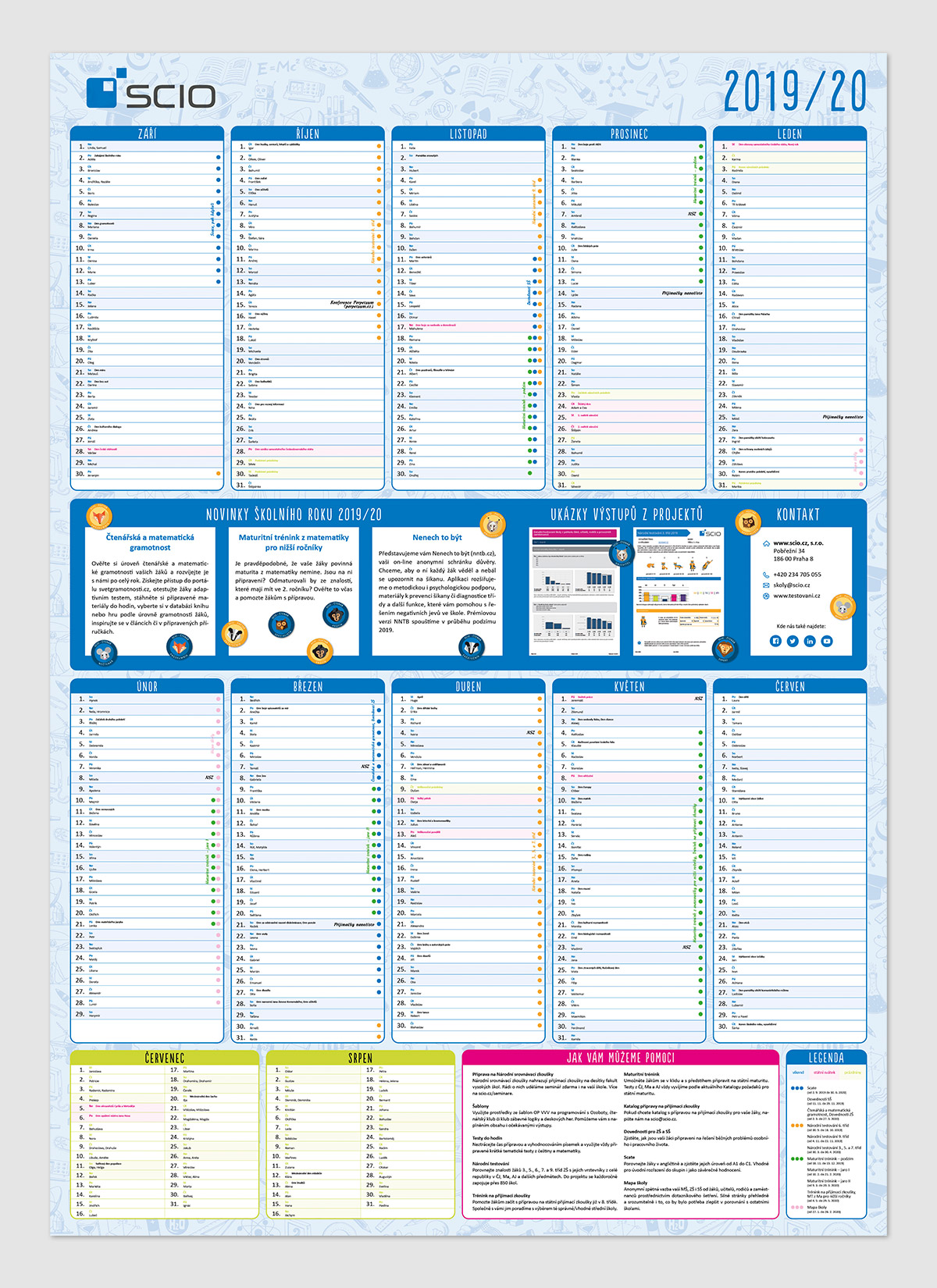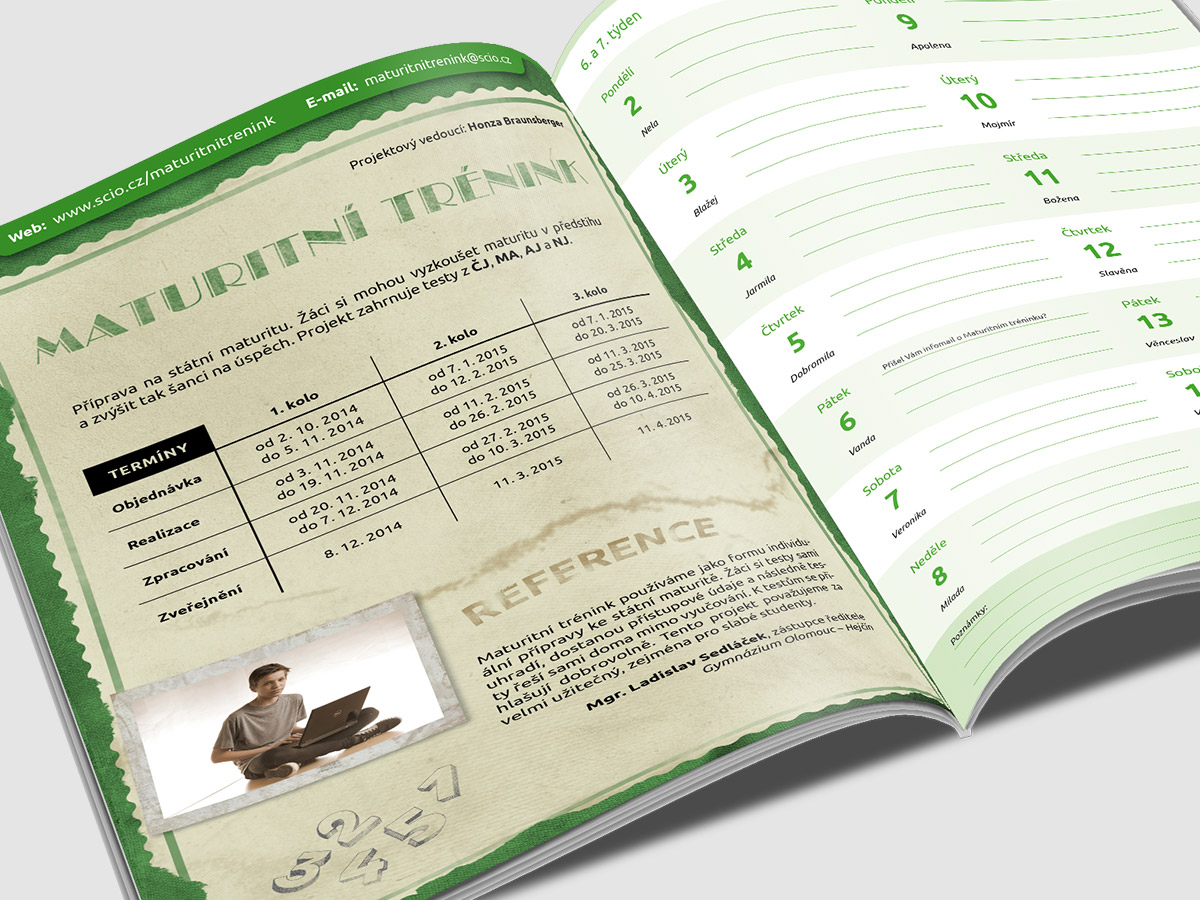 Popis: Návrh, grafická úprava, sazba i předtisková příprava diářů pro ZŠ a SŠ. Diář obsahuje také nabídku produktů společnosti Scio. Kromě diářů také každoročně připravuji nástěnný kalendář, určený pro učitele.
